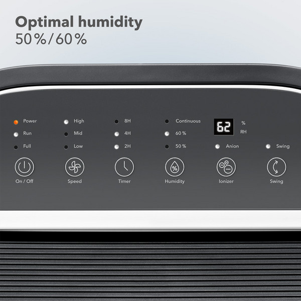 Átekinthető kezelőfelület. A modern LED kijelzős vezérlőpanel egyszerűen gyönyörű és rendkívül felhasználóbarát. Minden beállítás másodpercek alatt elvégezhető egy gombnyomással, mint például a higrosztát által vezérelt automatikus párátlanítás, a folyamatos működés, a swing funkció, a kapcsolható ionizáló és a praktikus időzítő az automatikus kikapcsolás biztosítására.