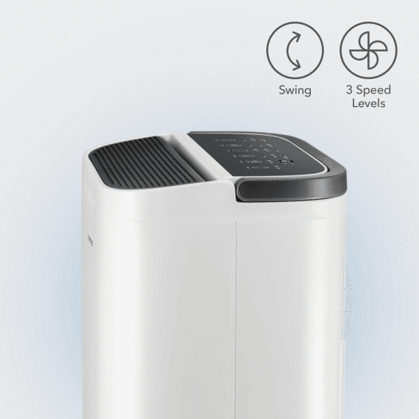 A helyiség egyenletes párátlanításához jó légkeringetésre van szükség. A háromfokozatú ventilátorsebességgel (max. 126 m³/h) a helyiségben szükséges légkeringetés gyakorisága optimálisan a helyiség méretéhez igazítható. A külön bekapcsolható swing funkció biztosítja, hogy a levegő eloszlása a bútorok és tárgyak között is optimális legyen.