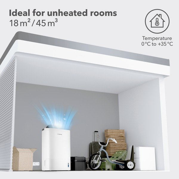 Nagyon hatékony, még alacsony hőmérsékleten is, egészen 0 Celsius fokig. A TTR 50 E az optimális párátlanító készülék fűtetlen vagy hűvös helyiségekben,18 m² vagy 45 m³ helyiségméretig.