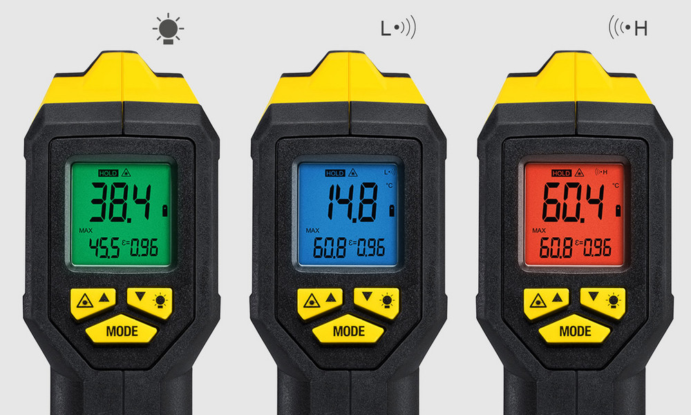 Egy meghatározott felső hőmérsékleti riasztási határérték túllépése esetén is riasztási jelzés hallható, a kijelző pedig pirosan villog. A kijelző színváltásának köszönhetően még a nagy kiterjedésű területek is gyorsan végigmérhetők anélkül, hogy minden egyes mérési értéket külön figyelnünk kellene.