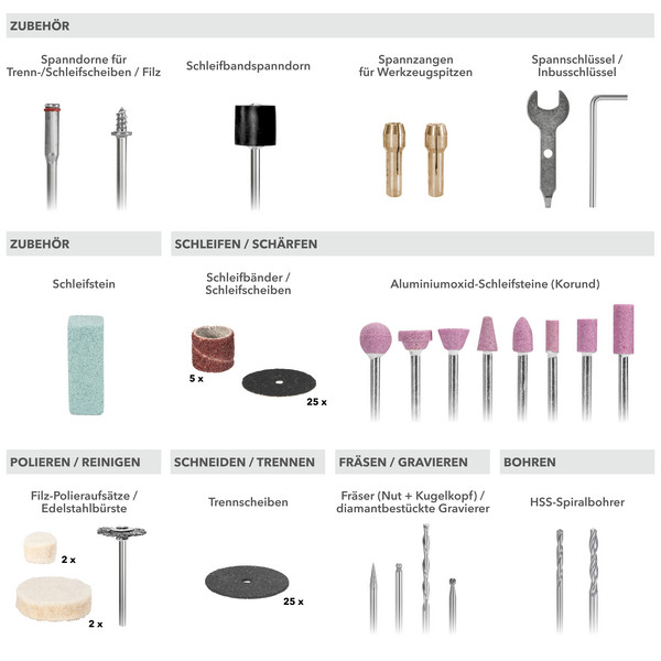 A PMTS 01-230V gravírozó 85 részes tartozékkészlete számtalan lehetséges alkalmazáshoz kínálja a megfelelő tartozékokat. A következőkben az egyes toldalékokat és tartozékokat ismertetjük alkalmazás szerint rendezve: