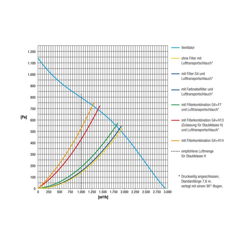 Műszaki magyarázat a tengelyekhez: • Függőleges tengely [Pa]: A rendszerben fellépő ellenállás (nyomás) Pascalban. Minél több a szűrő, annál nagyobb ez az érték. • Vízszintes tengely [m³/h]: A ténylegesen kifújt tiszta levegő mennyisége óránként. Fontos megjegyzés a csillaggal (*) jelölt sorokhoz: A mérések nyomóoldalon csatlakoztatott, 7,6 méter hosszú standard légtömlővel készültek, amelyet egy 90°-os ívben fektettek le.