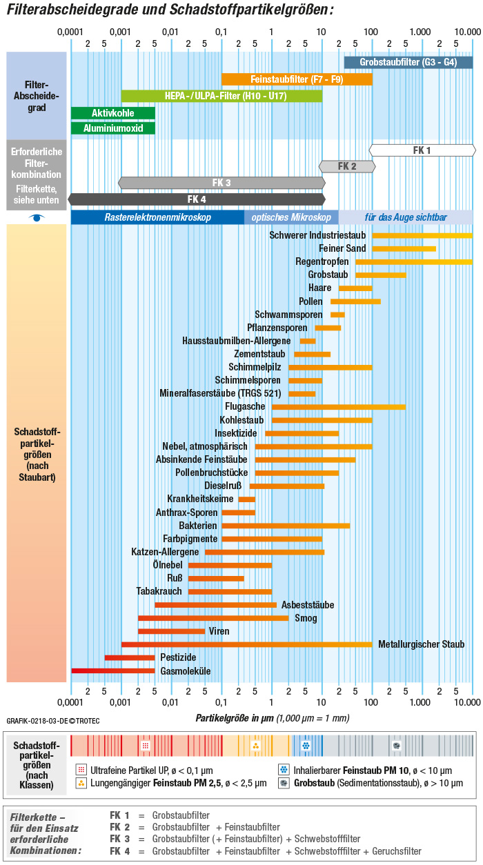 A levegőben található károsanyag-részecskék méretük szerint osztályozhatóak. A mellékelt grafika gyakorlatias áttekintést nyújt arról, hogy mely légszennyezettségi szintek esetén milyen szűrési fokozatokat és szűrőkombinációkat kell alkalmazni (a méretadatok mikrométerben értendők; egy mikrométer a milliméter ezredrészének felel meg).