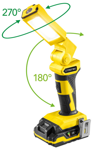 Két stabil és jó szögben elhelyezett csukló az oka, miért lehet a PWLS 10-20V munkalámpát egyszerűen és gyorsan gyakorlatilag minden világítási pozícióba beállítani. Míg a dönthető csukló egy 7 pozícióba pattintható fokozattal 180°-os dőlésszögű hatósugarat tesz lehetővé, a munkafény ezen felül a fordítócsukló segítségével 270°-ban elfordítható. A két csukló állítási kombinációja révén a megvilágított terület gyakorlatilag igény szerint minden célpozícióra ráirányítható. Hogy ne legyen fárasztó a kézben tartott használat, a munkalámpát ergonomikus, puha betétekkel ellátott csúszásbiztos markolattal láttuk el. De természetesen a munkalámpa használható álló lámpaként vagy fektetve vagy felakasztott helyzetben is. Ezt egy beépített kihajtható horog teszi lehetővé. Ezen felül a szállítási terjedelem részeként mellékelünk egy felszerelhető övakasztót, amire felakasztva ha magunkkal visszük, lényegesen könnyebb a lámpa gyors elérése, használata.