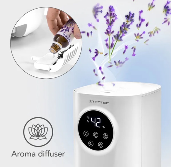 A lakótérbarát kialakítású B 7 E légnedvesítő beépített illóolajtartállyal rendelkezik, a helyiség levegőjének aromatizálására. Ide csöppentve csupán néhány csepp illóolaj elegendő ahhoz, hogy hatása jótékonyan stimulálja az egész testet, és pozitív hatással legyen általános közérzetünkre.
